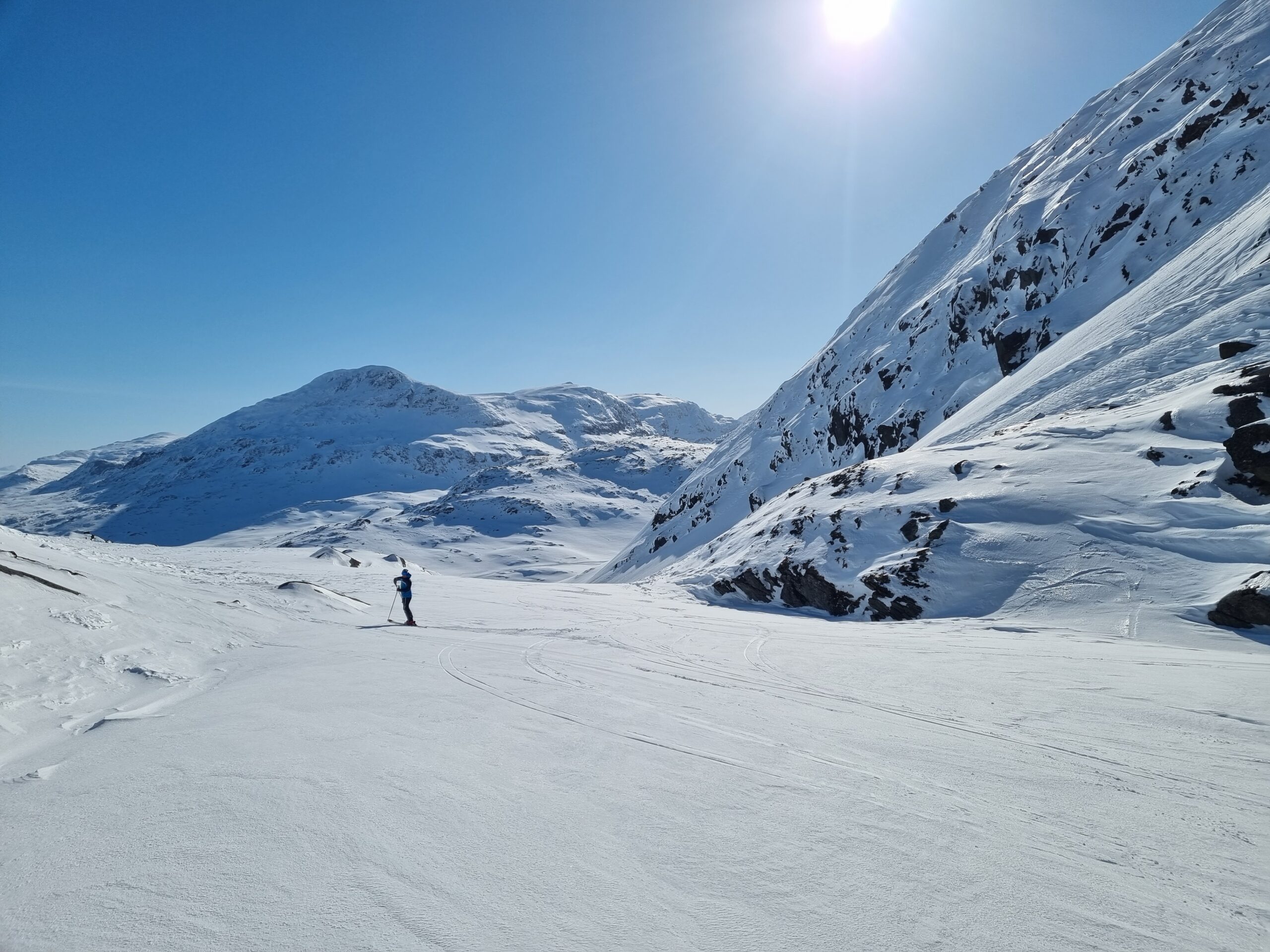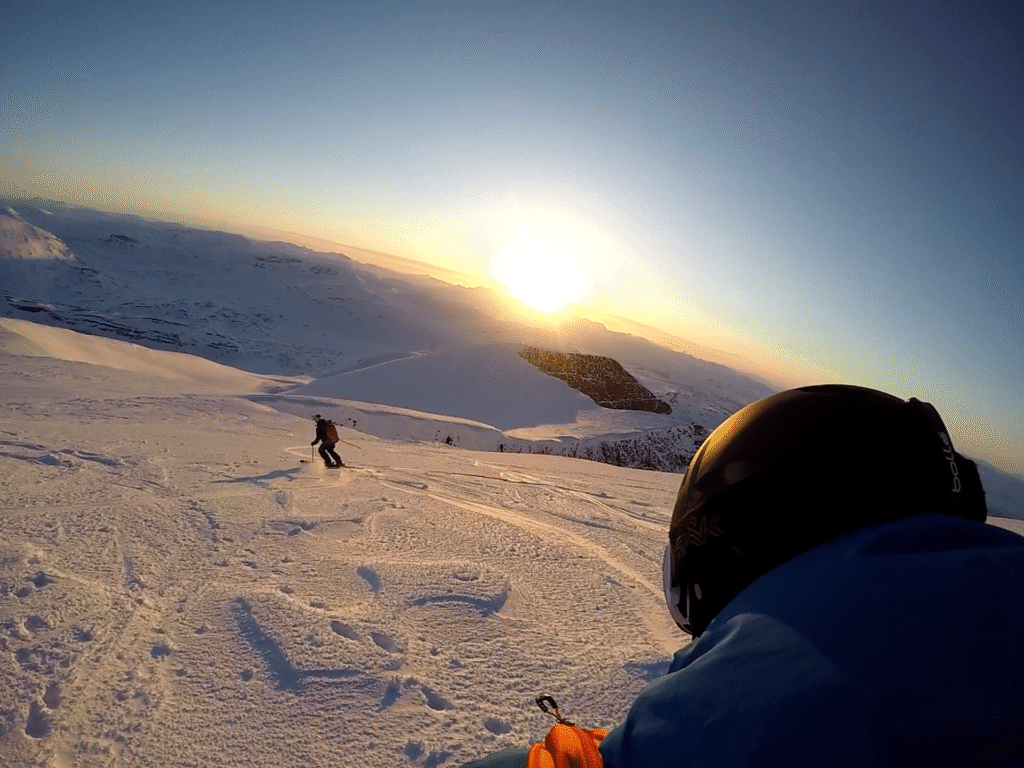 Offpist i orörd pulversnö med midnattssol runt om Kebnekaise. Andra aktiviteter är Pist skidåkning, Topptur skidåkning, snöskoter, isklättring och afterski.